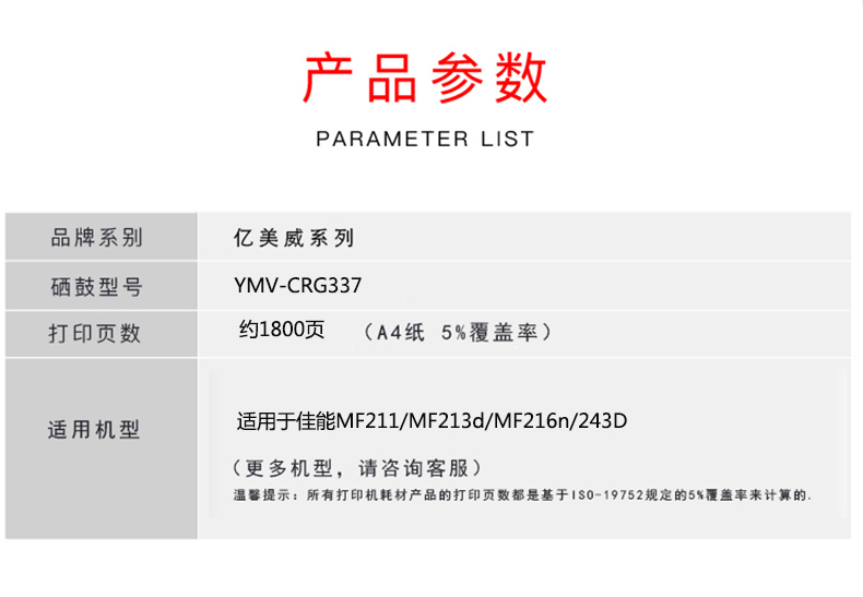 億美威 YMV-CRG337 適用于佳能MF211/MF213D/MF216/243D 全國統(tǒng)一價:178元